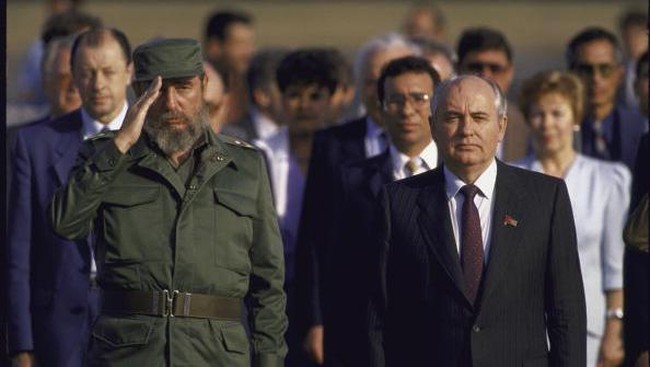 Presiden Kuba Fidel Castro menyambut Kepala Negara Uni Soviet Mikhail Gorbachev selama kunjungan resminya ke Kuba di bandara Havana, Selasa (4/4/1989). (Dirck Halstead/Getty Images)