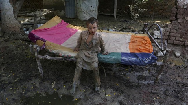 Seorang anak laki-laki berdiri di lumpur setelah banjir melanda rumahnya, di Charsadda, Pakistan, Rabu (31/8/2022). Banjir bandang telah menghancurkan sebagian besar wilayah Pakistan. (AP Photo/Mohammad Sajjad)