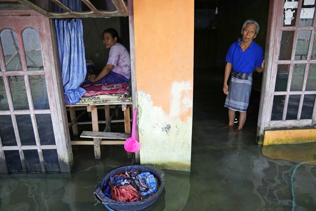 Sudarto berdiri di depan pintu dan putrinya Turiah yang duduk di atas kasur beralas kayu yang ditinggikan untuk mencegah banjir ari laut pasang (rob). Turiah mempunyai cacat fisik yang menghalanginya dari pekerjaan normal di Desa Timbulsloko, Demak, Jawa Tengah, Minggu (31/7/2022).