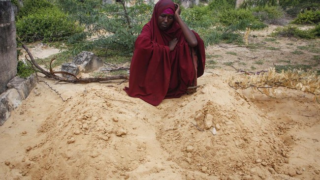 Fatuma Abdi Aliyow duduk di dekat kuburan kedua putranya yang meninggal karena gizi buruk di Mogadishu, Somalia, Sabtu (3/9/2022).