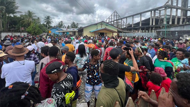 Ribuan Jemaat Gereja tampak berkumpul di pelataran gereja Kingmi Mile 32 pada Selasa pagi waktu setempat. Mereka kemudian melanjutkan aksi ke gedung DPRD Mimika di Jalan Cenderawasih, Mimika, Papua.