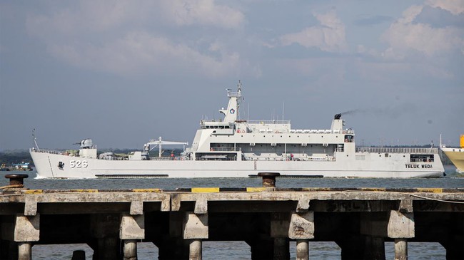 KRI Teluk Weda-526 melintas di Selat Madura, Jawa Timur, Rabu (7/9/2022). KRI itu dikerahkan untuk mencari pesawat latih TNI AL jenis Bonanza G-36 T-2503 yang jatuh di Selat Madura.
