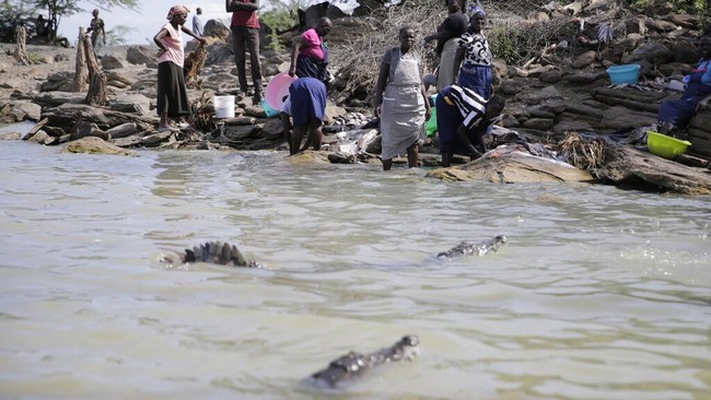 Kenya - Perempuan di Kenya ini mencuci baju di danau yang dipenuhi buaya liar. Ngeri-ngeri sedap karena tidak ada pilihan lain. Begini penampakannya.
