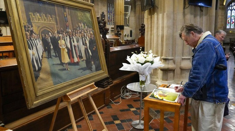 Seorang pria menandatangani buku belasungkawa di Katedral St. Andrews setelah meninggalnya Ratu Elizabeth II di Sydney, Australia, Jumat (9/9/2022) waktu setempat. (AP Photo/Mark Baker)