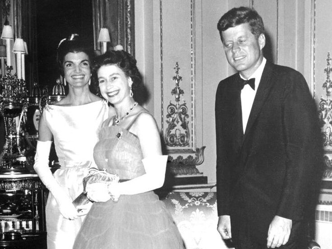 Momen saat Ratu Elizabeth II, mengajak Presiden AS John F. Kennedy dan istrinya Jacqueline Kennedy, berjalan memasuki ruang depan di Istana Buckingham, London, 5 Juni 1961, untuk makan malam bersama. (AP Photo/File)