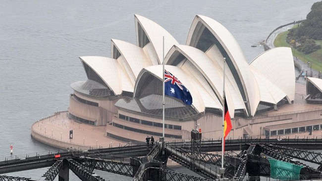 Bendera setengah tiang berkibar di Sydney Harbour Bridge, Kamis (8/9). Sydney Harbour dipenuhi landmark kota yang dikenal dunia.