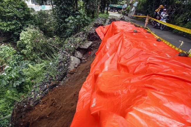 Jakarta - Hujan lebat di Bogor membuat bibir sungai longsor. Saat ini, garis polisi terpasang dan terpal oranye menutupi tanah longsor itu. Begini kondisinya.