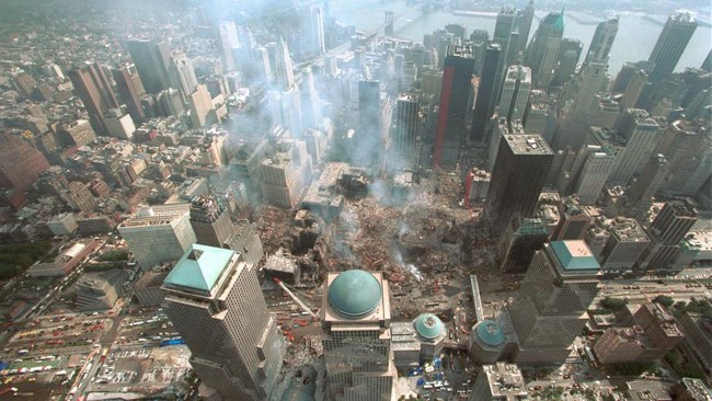 Penampakkan dari udara menara kembar World Trade Center (WTC) yang runtuh usai serangan teroris di New York, Amerika Serikat, 11 September 2001.
