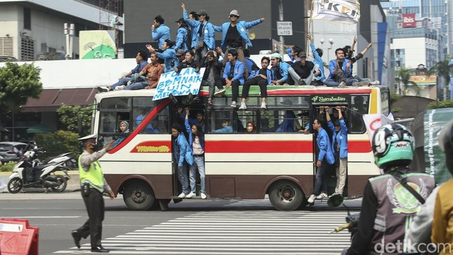 Jakarta - Ribuan massa dari aliansi mahasiswa dan buruh berunjuk rasa di kawasan Patung Kuda. Mereka demo dengan sejumlah tuntutan terkait bbm kepada pemerintah.
