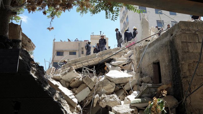 Yordania - Sebuah gedung tempat tinggal di Amman, Yordania, ambruk dan menewaskan sejumlah orang. Petugas penyelamat berjibaku mencari korban di antara reruntuhan.