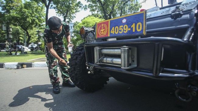 Seorang anggota TNI memeriksa alutsista yang dipajang jelang HUT TNI di Jalan Merdeka Utara, Jakarta, Selasa (4/10/2022).