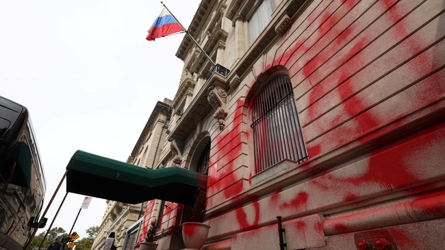 New York - Kantor Konsulat Rusia di New York menjadi sasaran vandalisme dengan coretan cat merah. Aksi ini diduga sebagai bentuk protes atas pencaplokan wilayah Ukraina.