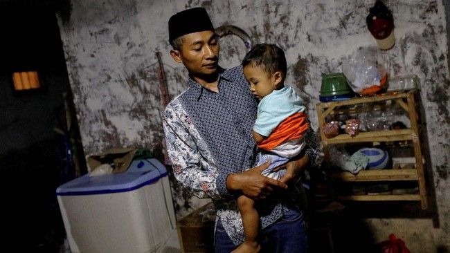 Andi Hariyanto (36) menggendong putranya yang berusia 2 tahun, Gean Putra Hariyanto, di rumahnya di Malang, Provinsi Jawa Timur, Indonesia, 4 Oktober 2022.
