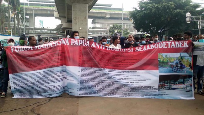 Jakarta - Ratusan mahasiswa asal Papua berdemo di kantor Kejagung RI. Mereka mendesak pengusutan dugaan korupsi pesawat dan helikopter di Kabupaten Mimika, Papua.
