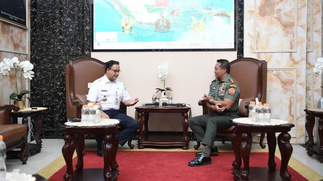 Jakarta - Gubernur DKI Jakarta Anies Baswedan menyempatkan diri menemui Panglima TNI Jenderal Andika Perkasa. Momen pertemuan keduanya berlangsung akrab.