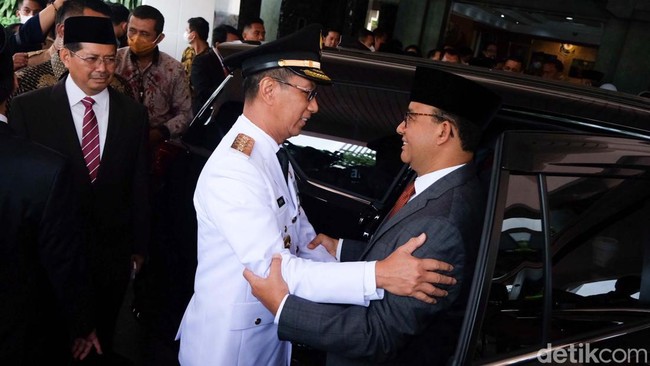 Jakarta - Pj Gubernur DKI Jakarta Heru Budi Hartono menjalani prosesi sertijab dengan Anies Baswedan. Keduanya bersalaman dan berpelukan usai sertijab.