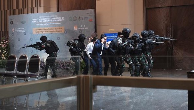 Malang - Pasukan elit TNI melakukan latihan pengamanan dari gangguan terorisme di sebuah hotel Malang. Latihan ini dilakukan jelang puncak KTT G20 di Bali.