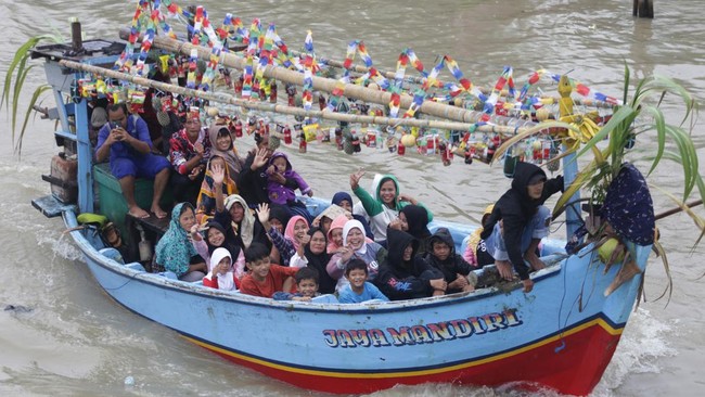 Jakarta - Warga menggelar Tradisi Nadran (Pesta Laut) di Sungai Cimanuk, Jawa Barat. Tradisi ini digelar sebagai rasa syukur atas hasil tangkapan udang yang melimpah.