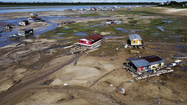 Brasil - Sungai Solimoes di Amazonas, Brasil, mengalami kekeringan parah. Rumah-rumah perahu yang dulunya berada di air, kini berada di daratan.