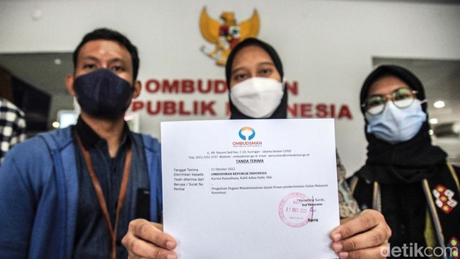 Jakarta - Aktivis dari Koalisi Masyarakat Sipil Penyelamat Kemerdekaan Peradilan mengadukan perihal pemberhentian hakim konstitusi Aswanto oleh DPR Ombudsman RI.