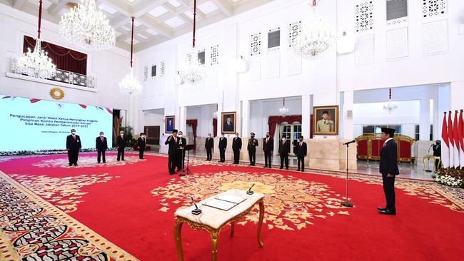 Jakarta - Johanis Tanak resmi menjadi pimpinan Komisi Pemberantasan Korupsi (KPK). Dia membacakan janji di depan Presiden Joko Widodo di Istana Negara, Jakarta.