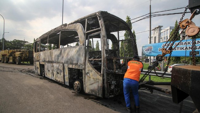 Penampakan Bus yang Terbakar di Exit Tol Menanggal Surabaya