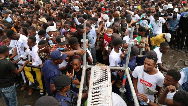 Orang-orang berdatangan untuk menghadiri konser penyanyi Kongo Fally Ipupa, di stadion Martyrs di Kinshasa, Republik Demokratik Kongo, Sabtu, (29/10/2022). Stadium of Martyrs di ibu kota disebut penuh sesak melebihi kapasitas 80.000 orang.