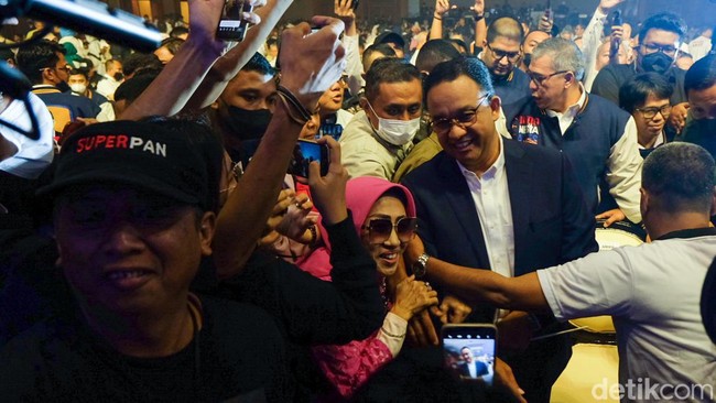 Jakarta - Bakal jadi capres, Anies Baswedan menghadiri deklarasi relawan IndonesiAnies di JCC Senayan, Jakarta. Anies menebar senyum saat bertemu relawan.
