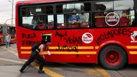 Seorang anggota kelompok feminis menendang bus selama protes terhadap dugaan pelecehan seksual terhadap seorang wanita di bawah umur di dalam stasiun transportasi umum Transmilenio, di Bogota, Kolombia 3 November 2022.