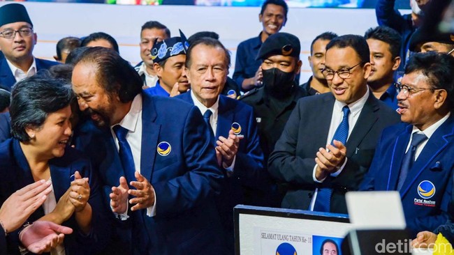 Jakarta - Anies Baswedan menghadiri peringatan HUT NasDem di Jakarta. Anies duduk di samping Ketum NasDem Surya Paloh dan juga mendapatkan potongan kue.