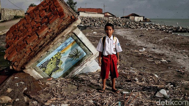 Jakarta - Rob yang terjadi di utara pulau Jawa juga mengancam Desa Cemara Jaya, Cibuaya, Kabupaten Karawang, Jawa Barat. Daerah pesisir ini terancam hilang imbas Abrasi.