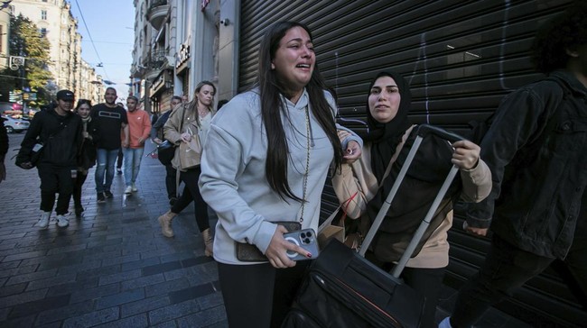 Para turis berlarian seusai ledakan terjadi di Istiklal Avenue, Minggu (13/11). Beberapa terlihat menangis.