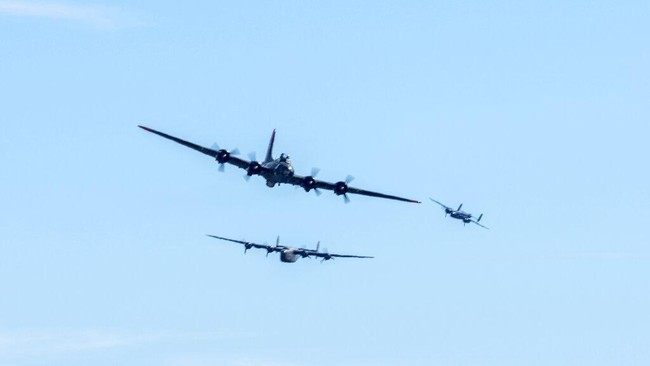 Sebuah Boeing B-17 Flying Fortress (depan), terlihat beberapa detik sebelum bertabrakan dengan Bell P-63 Kingcobra di udara selama pertunjukan udara di Bandara Eksekutif Dallas di Dallas, Sabtu, (12/11/2022). AP/Larry Petterborg