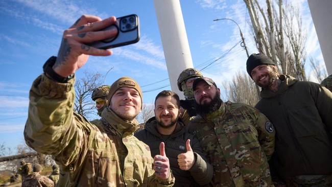 Ukraina - Presiden Ukraina Volodymyr Zelensky mengunjungi Kherson setelah Rusia mundur dari wilayah tersebut. Zelensky pun jadi sasaran foto bersama tentara Ukraina.