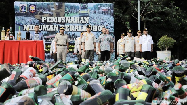 Jakarta - Pemprov DKI Jakarta memusnahkan 14 ribu minuman beralkohol di kawasan Monas, Jakarta, Jumat (18/11/2022). Ini merupakan hasil penertiban selama tahun 2021.