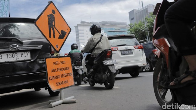 Jakarta - Antrean kendaraan terjadi di traffic light Jalan Gunung Sahari, Jakarta Pusat arah Pasar Baru. Kemacetan imbas adanya pekerjaan galian saluran rumah pompa.