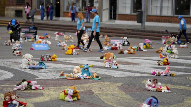 Bogota - Warga Kolombia memprotes kekerasan terhadap anak-anak dengan cara menutupi jalanan menggunakan boneka. Begini aksinya.