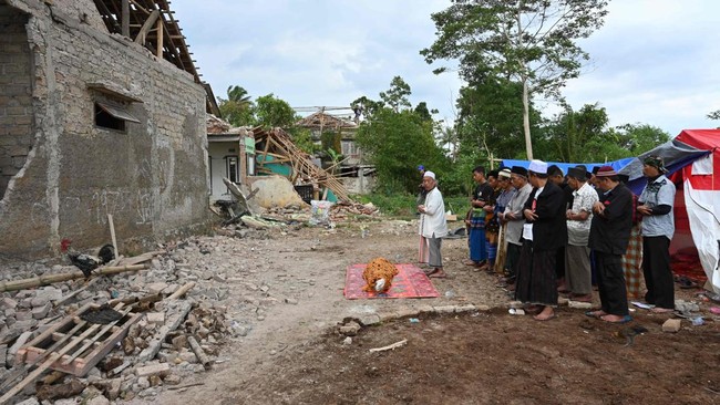 Korban Gempa Cianjur Gelar Salat Jenazah di Antara Reruntuhan