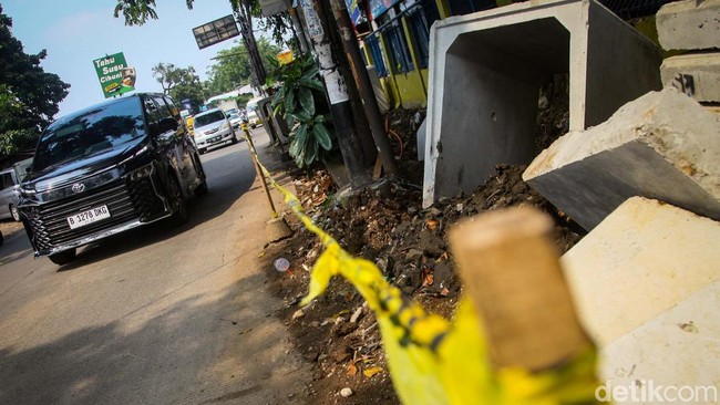 Tangerang - Proyek saluran air tengah dikerjakan di Jalan Raya Cirendeu, Kota Tangerang Selatan. Namun, material gorong-gorong berserakan di trotoar jalan.