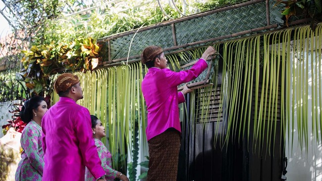 Solo - Prosesi siraman putra Presiden Jokowi, Kaesang Pangarep segera dimulai. Jokowi memasang bleketepe atau anyaman daun kelapa di kediamannya Solo, Jawa Tengah.