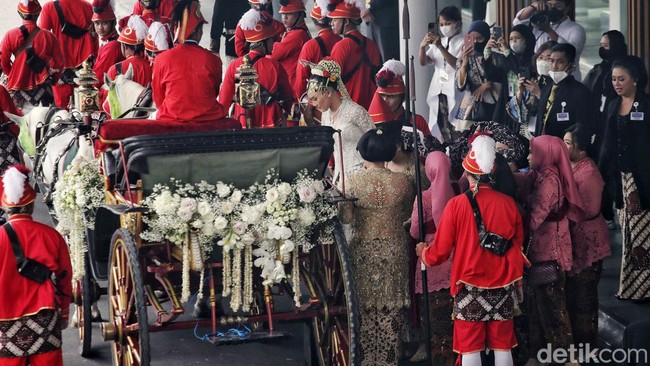 Sleman - Erina Gudono menuju tempat ijab kabul di Pendopo Agung Kedaton Ambarrukmo menggunakan kereta kuda, Sabtu (10/12). Erina duduk bersama kedua kakaknya.