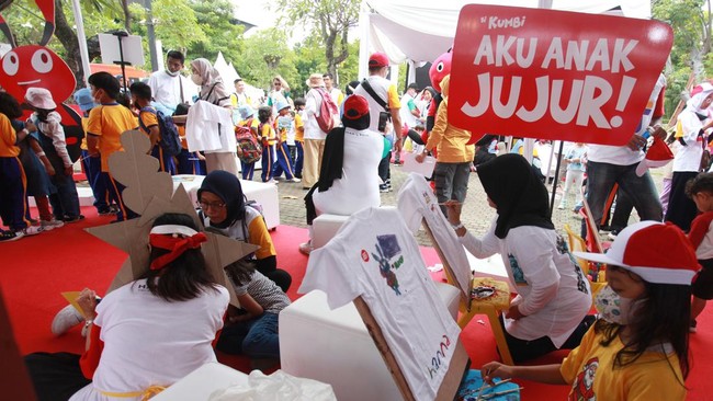 Warga melukis di salah satu stan dalam rangkaian kegiatan jalan sehat memperingati Hari Antikorupsi Sedunia (Hakordia) 2022 di Gelora Bung Karno, Jakarta, Minggu (11/12/2022).