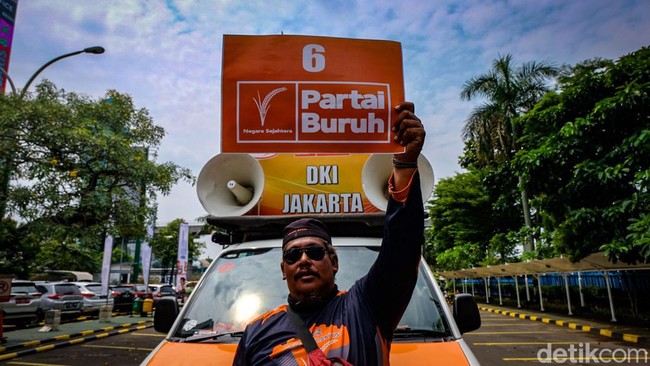 Jakarta - Partai Buruh menggelar demo di depan kantor Kemnaker, Jakarta, Senin (19/12/2022). Demo digelar dalam rangka Hari Migran Internasional.