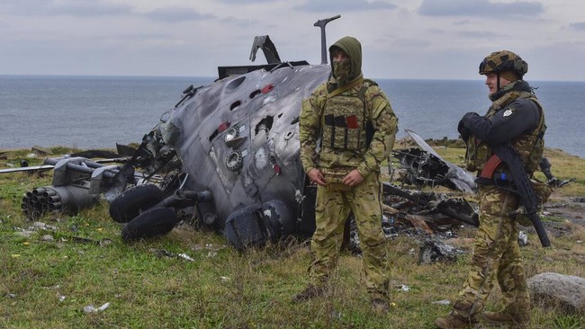 Kini Pulau Ular kembali dikuasai oleh Ukraina. Tampak dua tentara Ukraina foto bersama dengan latar belakang helikopter Rusia yang rusak.