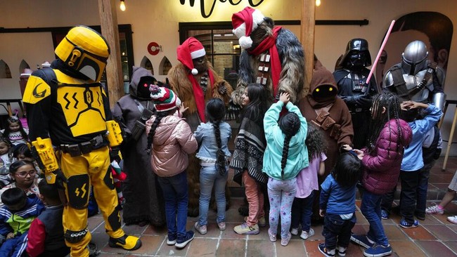 Bogota - Libur Natal telah tiba. Para relawan dari yayasan di Kolombia menghibur sekaligus membagikan hadiah kepada anak-anak kecil dengan mengenakan kostum star Wars.