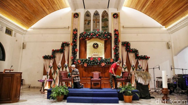 Jakarta - Menjelang misa Natal, berbagai persiapan dilakukan di GKI Kwitang, Jakarta, Sabtu (24/12). Pemasangan ornamen hingga bersih-bersih dilakukan di gereja tersebut.