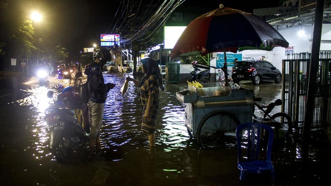 Seorang pedagang melayani pembeli saat banjir rob di Jalan Jafri Zam-Zam, Banjarmasin, Kalimantan Selatan, Senin (26/12/2022).