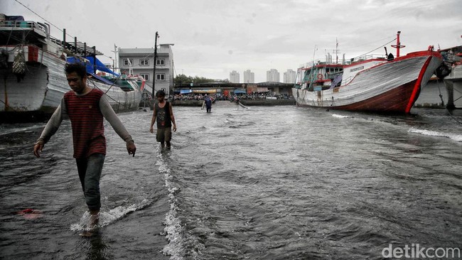 Jakarta - Banjir rob melanda kawasan Pelabuhan Muara Baru, Jakarta Utara, saat siang menjelang sore hari. Begini aktivitas warganya.