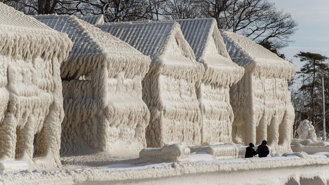 Kanada - Badai salju dahsyat telah membekukan rumah-rumah di tepi pantai Crystal Beach, Kanada. Akibatnya aktivitas warga pun lumpuh.