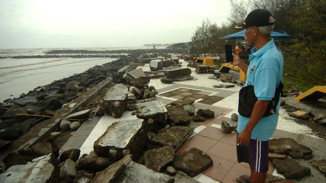 Tegal - Tembok Jogging Track sepanjang 35 meter di Pantai Alam Indah, Tegal hancur diterjang ombak besar. Kejadian ini terjadi pukul 03:00 WIB.